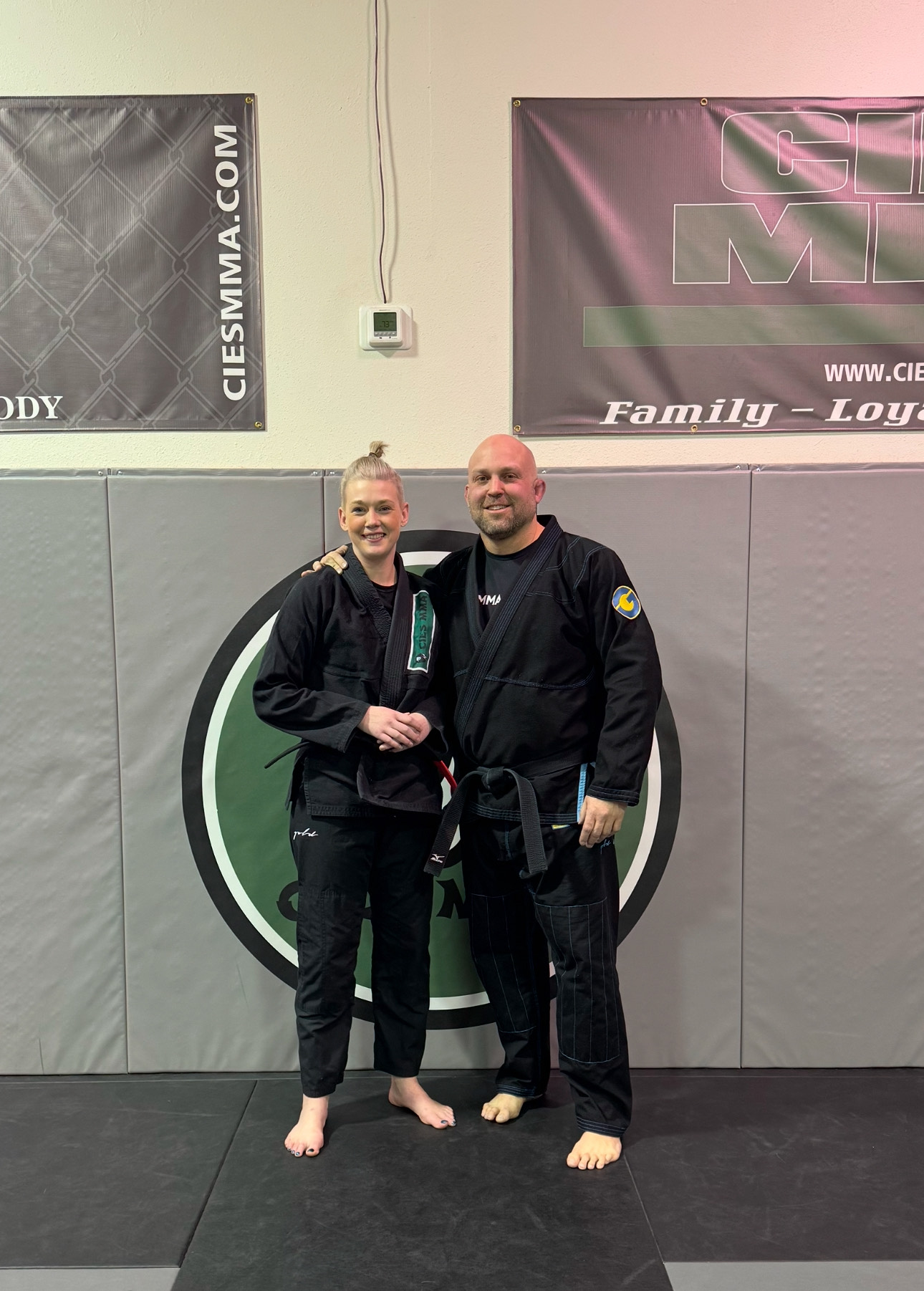 We are proud to have coach Barb Ciesnolevicz as the gym's first ever BJJ Black belt. Barb started BJJ in 2012 but the military led her to Colorado Springs and to Cies MMA as one of its first members in 2016. Starting as a white belt at our gym, with some experience, Barb always showed eagerness to learn and improve. She has hundreds of BJJ matches, some being against high level black belts such as UFC title challenger Roxanne Modaferri winning in regulation as a purple belt. She also climbed her way to the #1 ranking for Gi in the IBJJF and #2 in the world for no gi at the purple belt level. Barb won a Bronze medal via triangle choke at the World Master IBJJF in 2024. Barb was our first athlete to also go pro in MMA, and boasts a 3-1 record in that discipline as well. More importantly Barb has consistently coached our kids program to success for the past 3 years, and also occasionally subs in to teach adult classes. Advice from Barb is to simply enjoy the journey. You blink one day and the white belt turns black. Alongside her faith, jiu jitsu is her second saving grace.