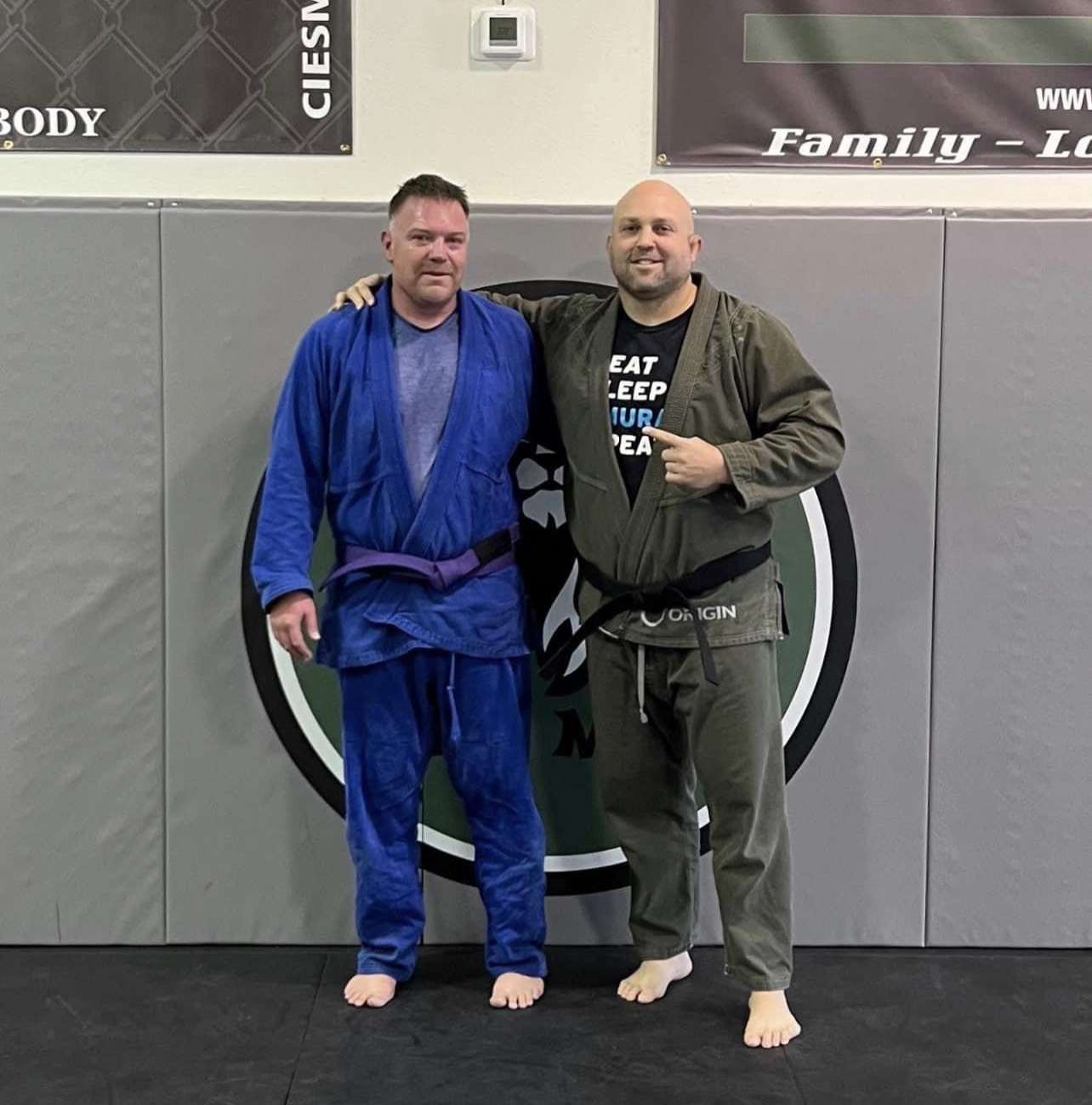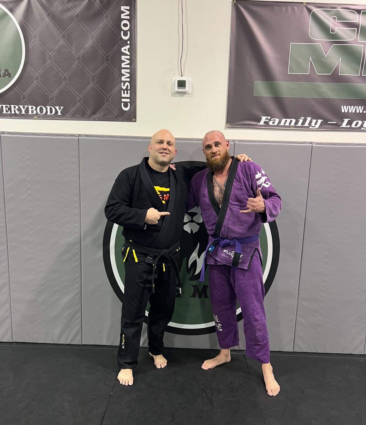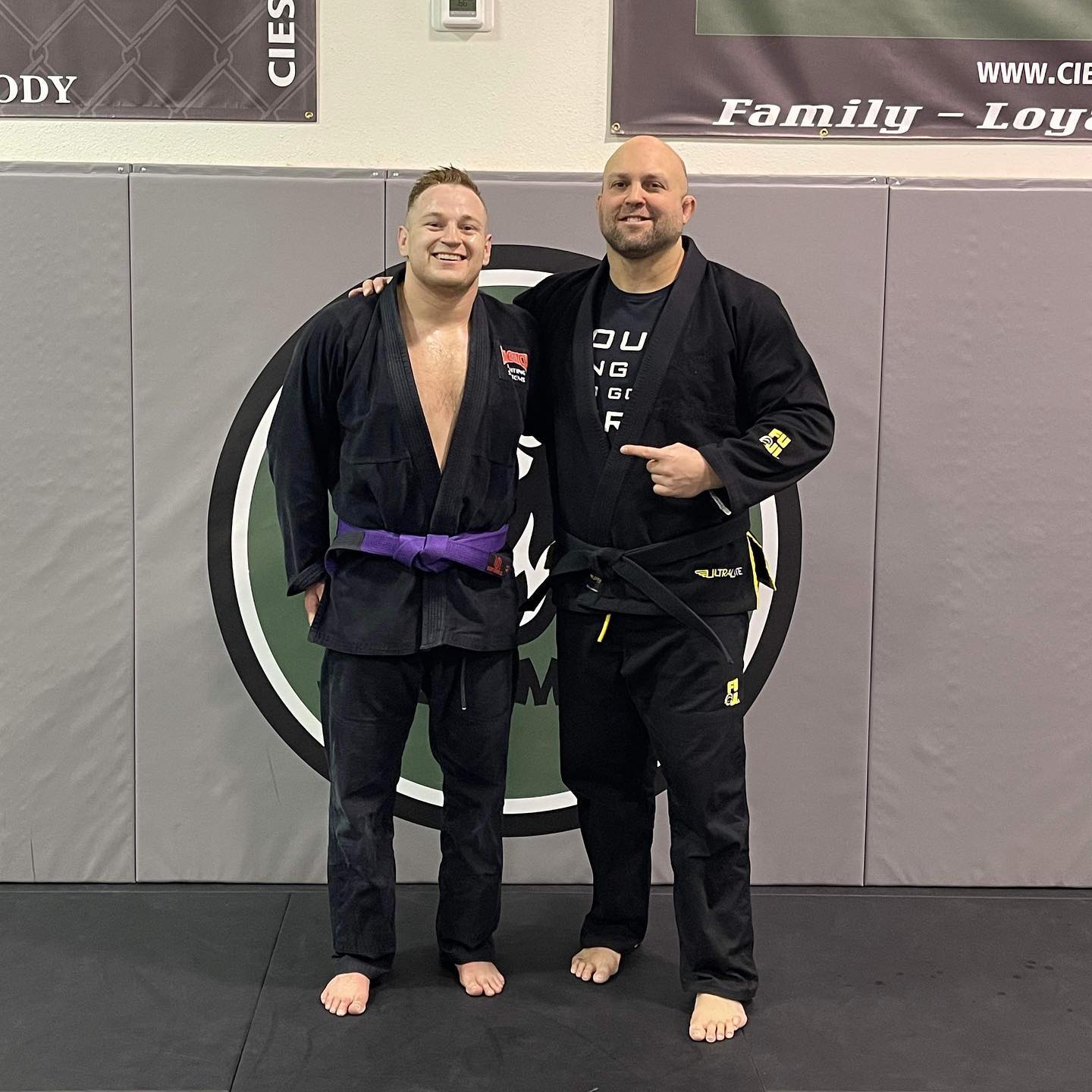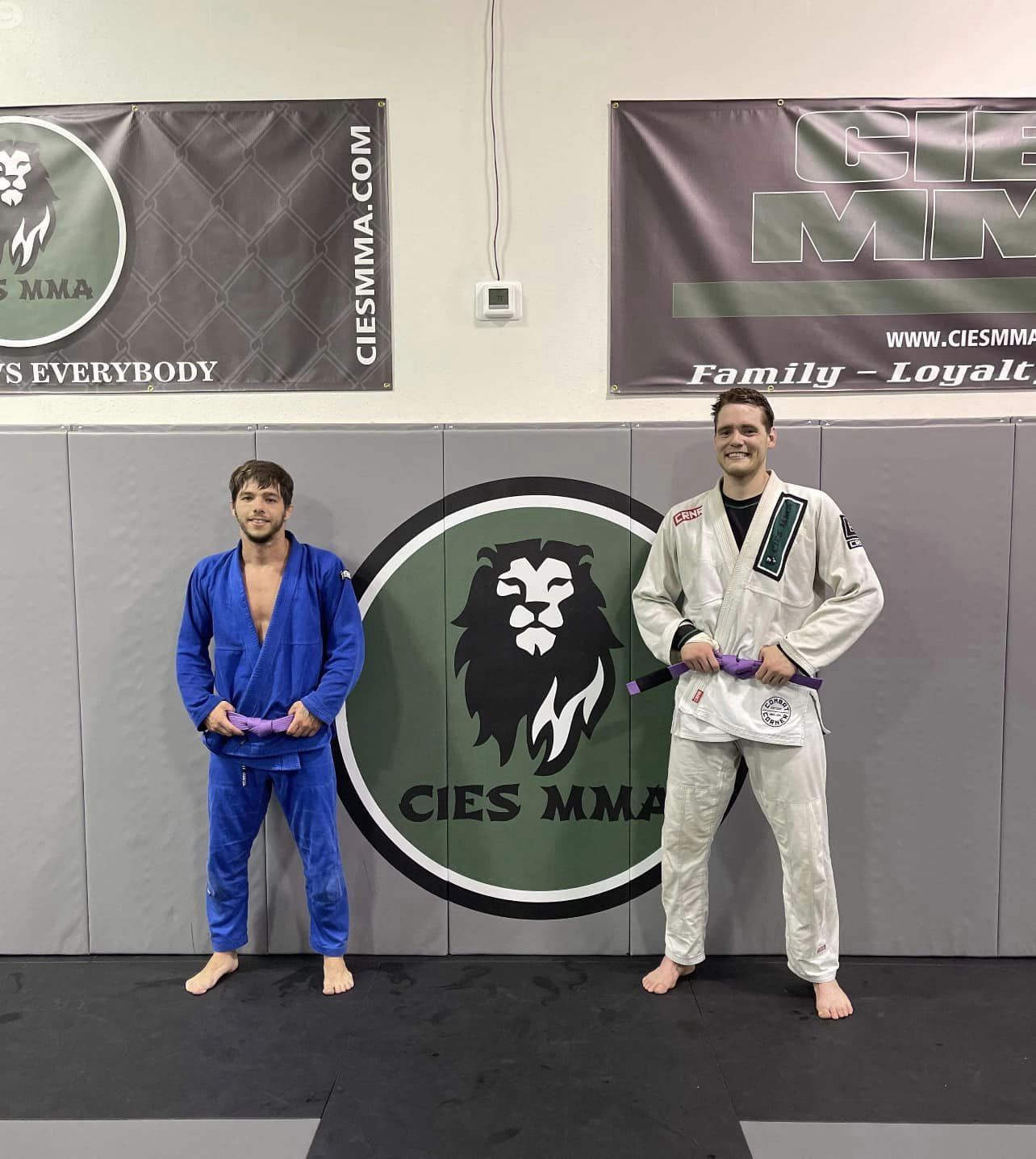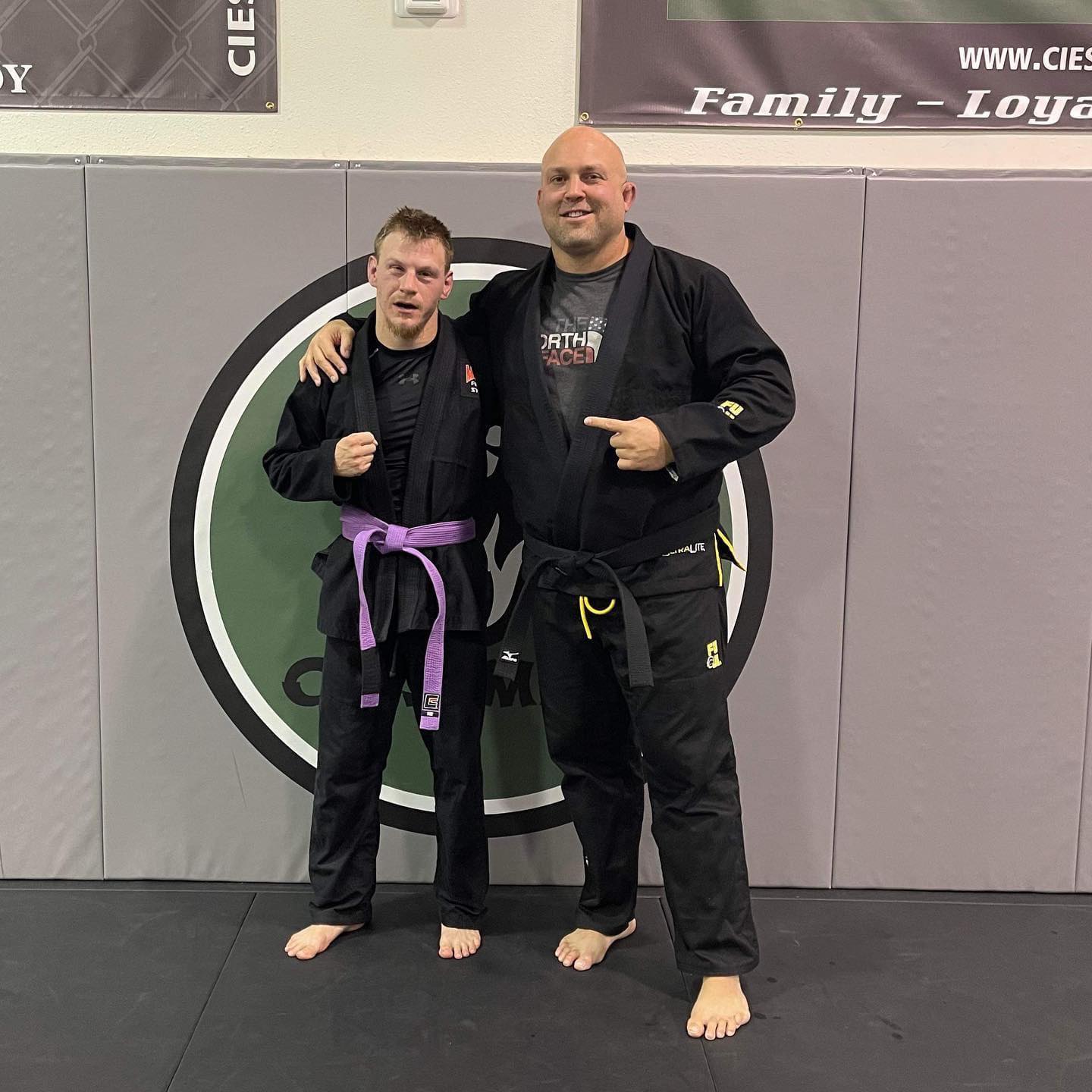 Steve has been a member of Cies MMA since March of 2017 and has always found a way into the gym no matter how busy his life gets. Steve commutes from around 1hr away just to train at our gym, and is a Lieutenant in the Monument Fire Department. An upstanding citizen and father, Steve exemplifies being a good person on and off the mats. It was professor Mike Ciesnolevicz's honor to promote Steve as his 8th ever purple belt on November 14th 2022.