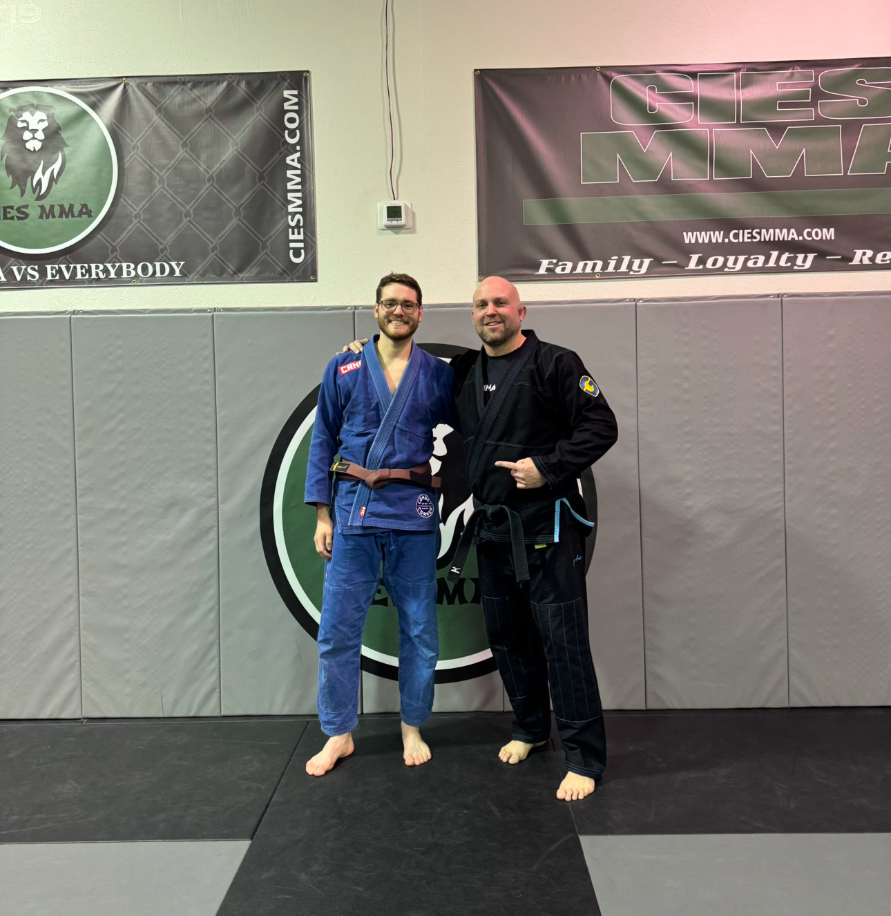 Aaron started at Cies MMA in early 2017 as a white belt, and has quickly progressed in his Jiu Jitsu. Aaron has been a firefighter since 2007 and has never let his schedule get in the way of training and learning the art of BJJ. What is most impressive about Aaron is his style, it mimics perfectly the style that Master Sergio Penha teaches. Aaron has gone to train at Sergio's multiple times and each time Prof Mike is given multiple compliments on Aaron's pressure oriented style of BJJ. If you get the pleasure of rolling with Aaron you will quickly understand what we mean when we say that. Aaron has competed and done extremely well for Cies MMA despite his busy schedule working and being a fireman, husband and father. It was Professor Mike's distinct honor to award his second ever brown belt to Aaron Gatti on April 1, 2024.